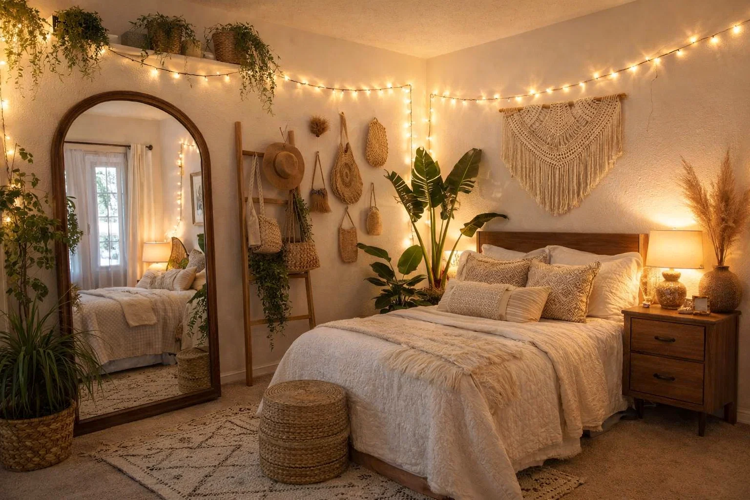 Now, infuse your personality. Hang a macramé piece or tapestry above your bed or on a large blank wall. Style your nightstands and dresser with curated clusters: a stack of books, a small plant, a unique jewelry dish, and a framed photo. Introduce several plants at different heights—a tall fiddle leaf fig in a corner, a medium plant on the dresser, and a few hanging pothos near a window. Remember, the key is to build these collections gradually.
