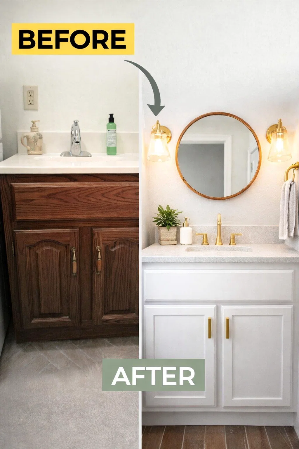 Never underestimate the power of a good mirror. If your vanity came with a basic frameless mirror glued to the wall, you can easily upgrade it by building a simple wooden frame around it or replacing it with a round or arched mirror. This adds a custom architectural element that makes the bathroom feel designed rather than just assembled. Update your light fixture to match your new hardware for a cohesive look that ties the whole renovation together.