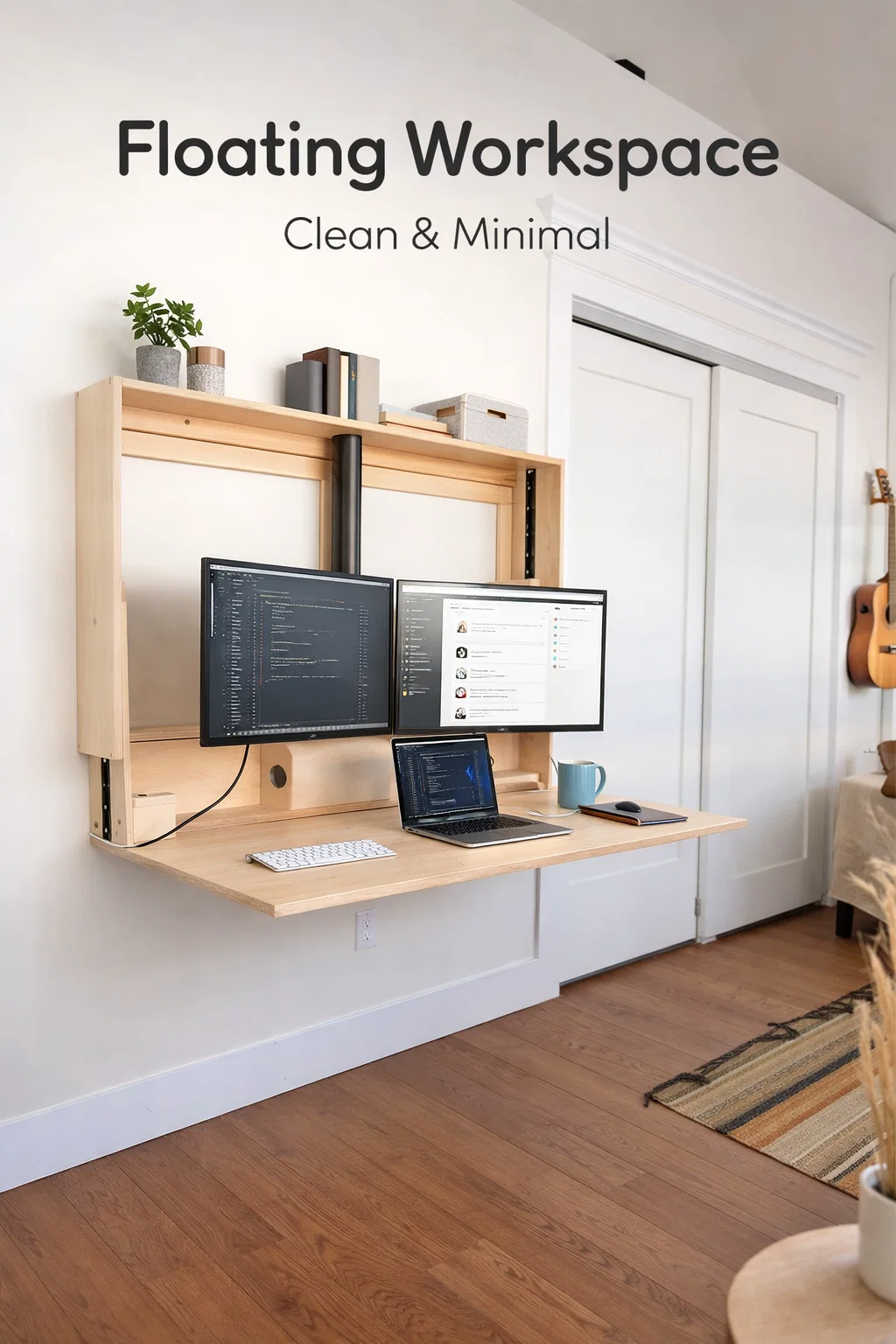 In the background of the image, we see a guitar hanging on the wall and a cozy rug. This reminds us that a workspace should reflect the personality of the person using it. Even with a minimalist desk, you can add “soul” to the area. Consider adding a small LED light strip inside the cabinet for ambient task lighting, or using a magnetic strip on the backboard to hold tools or photos. The plywood serves as a blank canvas for your professional identity.