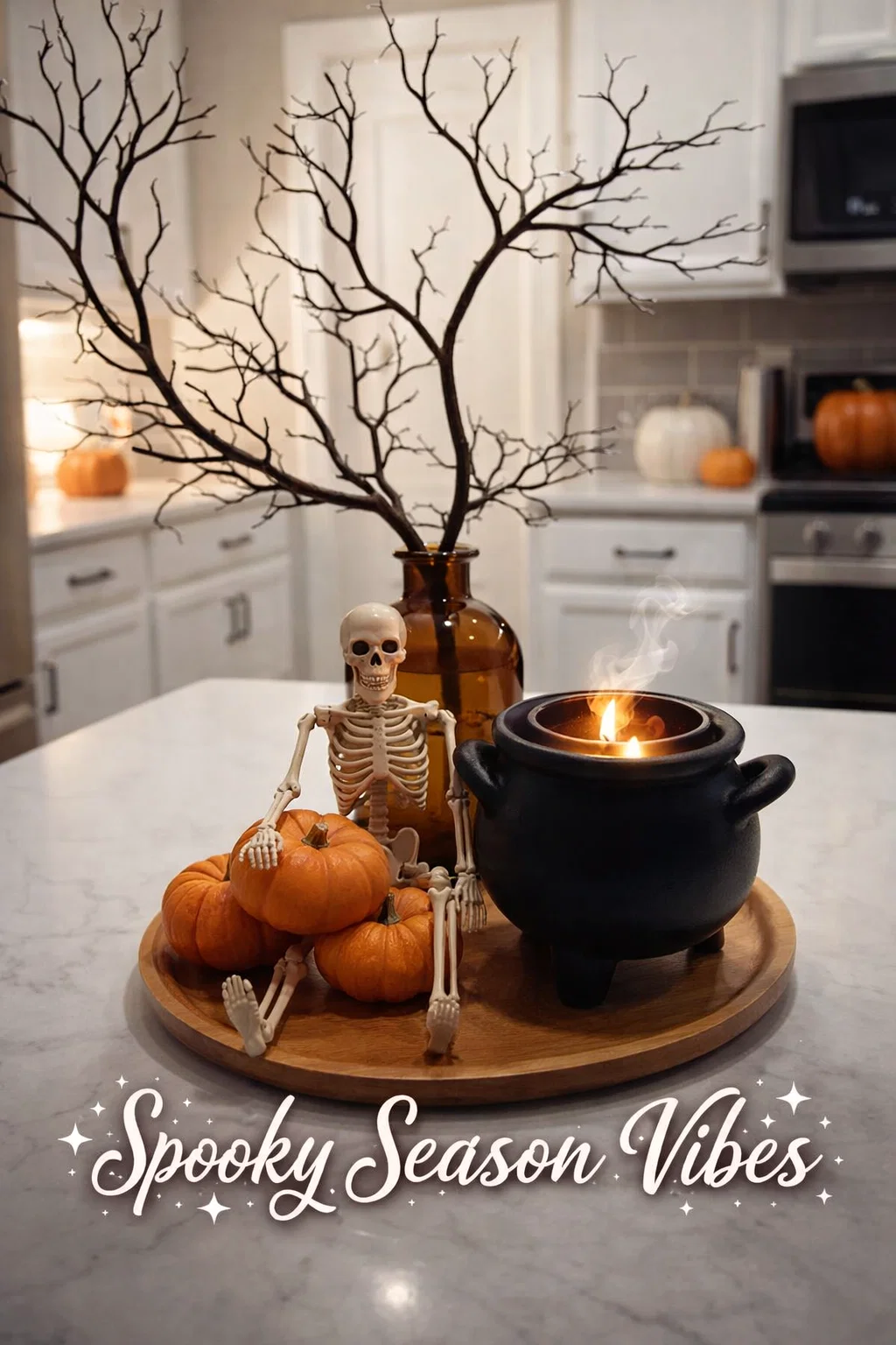 When styling an island, you have to consider that people will see the decor from all sides. A circular tray is an ideal choice because it looks good from every angle. Ensure that the skeleton is positioned so its “face” is visible from the main walkway, and vary the placement of the pumpkins so there is no obvious “back” to the arrangement. This 360-degree approach ensures that your hard work is appreciated whether you are standing at the stove or sitting at the breakfast bar.