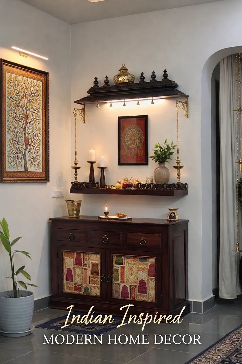 Incorporating a small indoor plant, such as the one in the metallic pot on the console, brings a touch of nature indoors. In many traditions, plants like Tulsi are considered sacred and are a staple in prayer areas. Even if you choose a non-religious indoor plant, the presence of living greenery helps in purifying the air and adding a vibrant, organic texture that balances the hard surfaces of the wood and metal.