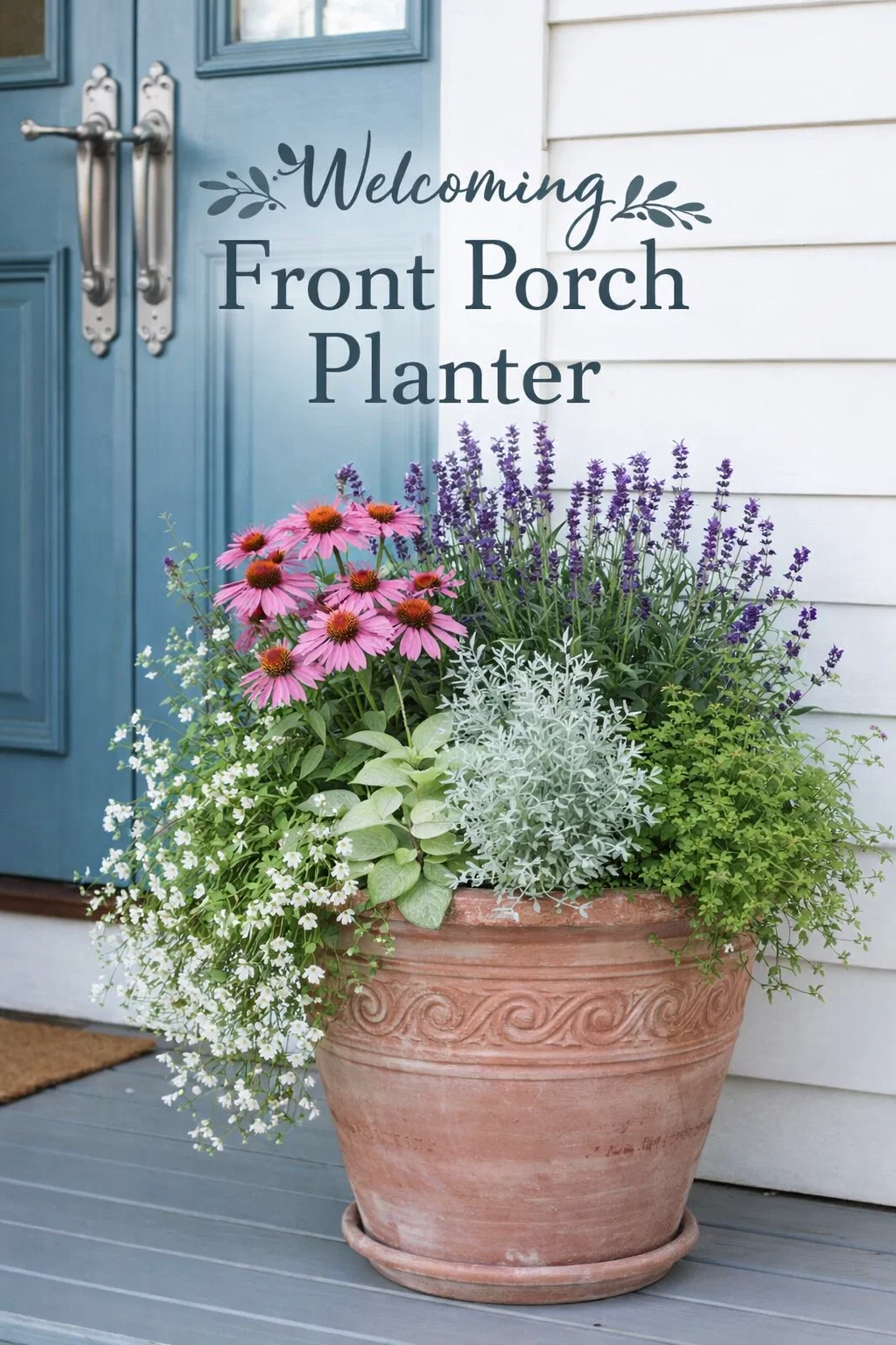 To truly elevate your front porch, you should consider the surrounding elements. Notice how the blue of the door in our inspiration image complements the purple hues of the lavender. This is not an accident. Using color theory to coordinate your planters with your front door or shutters can make your home look professionally designed. If you have a neutral home, a pop of color in your planters can serve as a focal point. If your home is already colorful, opting for the silvery greens and whites seen here can provide a sophisticated balance.
