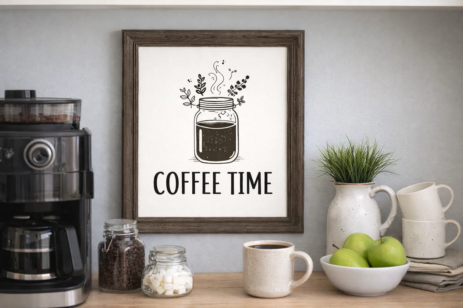 • For Small Spaces/Renters: Utilize a floating shelf as your mini coffee bar. A single beautiful printable coffee sign in a thrifted frame, paired with a sleek machine and a couple of mugs, creates a full vignette. Use removable peel-and-stick backsplash tiles behind the shelf for a rustic “wall” effect.