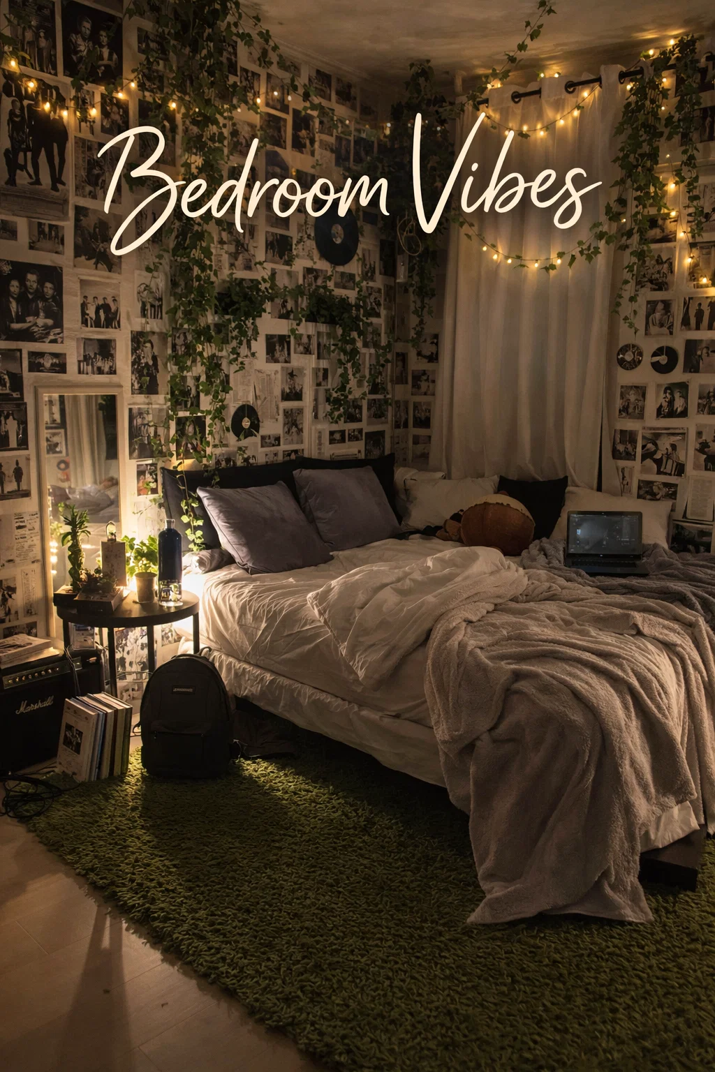 One might think that a dark, moody room would shun nature, but the opposite is true. The use of hanging vines is a staple of the indie aesthetic. The green leaves provide a necessary pop of organic color against the black and white backdrop of the posters. In the image, we see artificial ivy cascading from the ceiling and draped over the bed frame. This softens the sharp corners of the room and brings a sense of life to the space.
