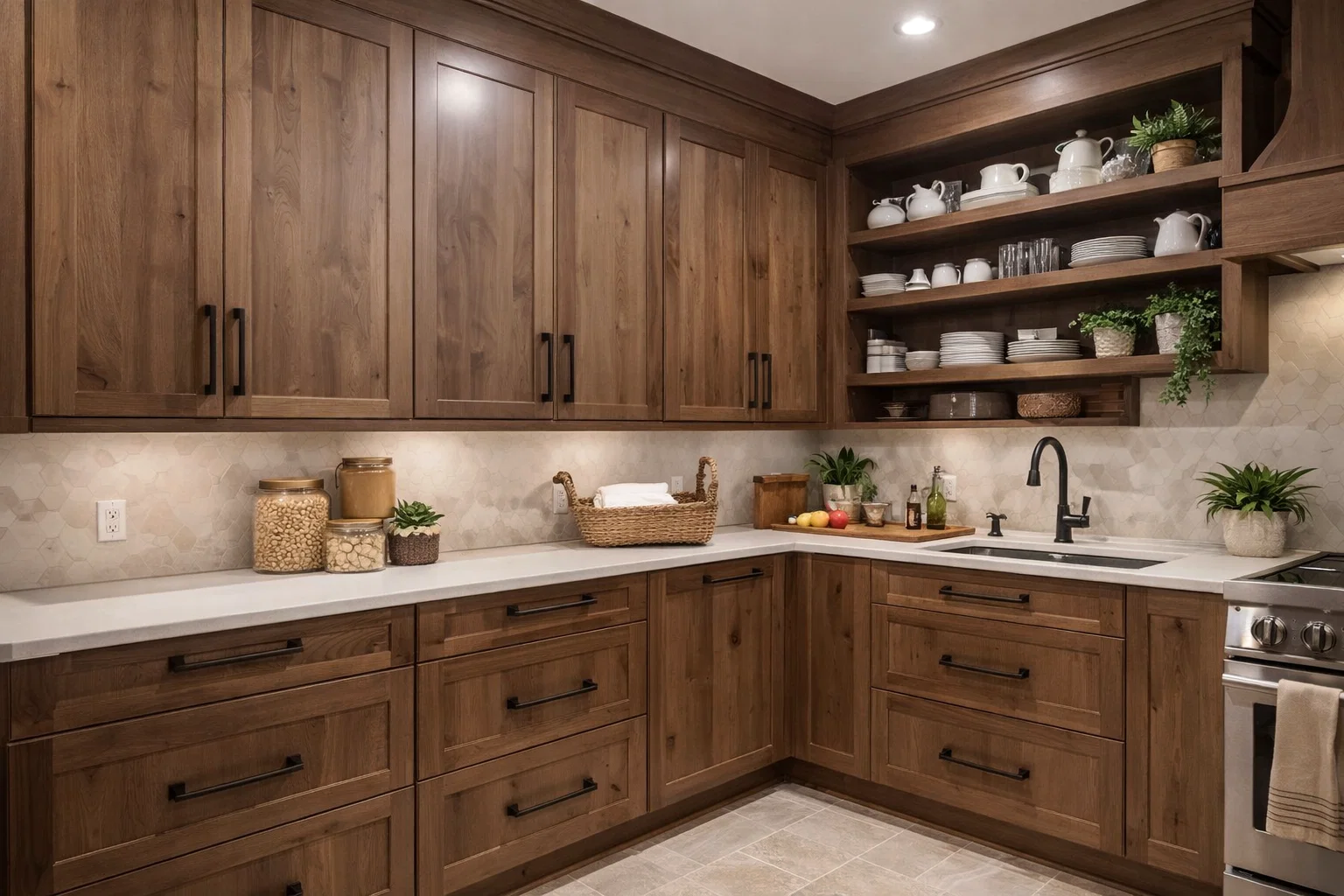 - For a Transitional Style: Combine the clean lines of a shaker door with a warm, medium-toned stain. Use mixed metals (e.g., brass hardware with a stainless steel faucet) and classic subway tile.