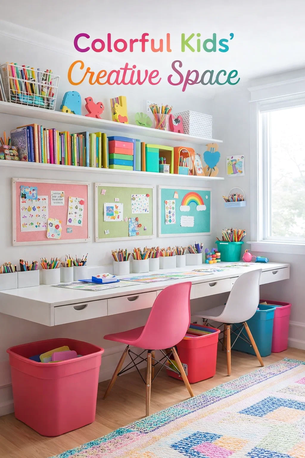 In this specific setup, the use of a crisp white desk and white walls provides a clean canvas. This allows the pops of yellow, teal, pink, and blue to stand out without feeling overwhelming. High-contrast elements help children visually categorize different areas of their desk. For example, a bright yellow chair clearly marks the “work zone,” while a series of colorful bins underneath signals the “storage zone.” This visual mapping helps younger children understand where they belong in the space and where their items should go when they are finished.