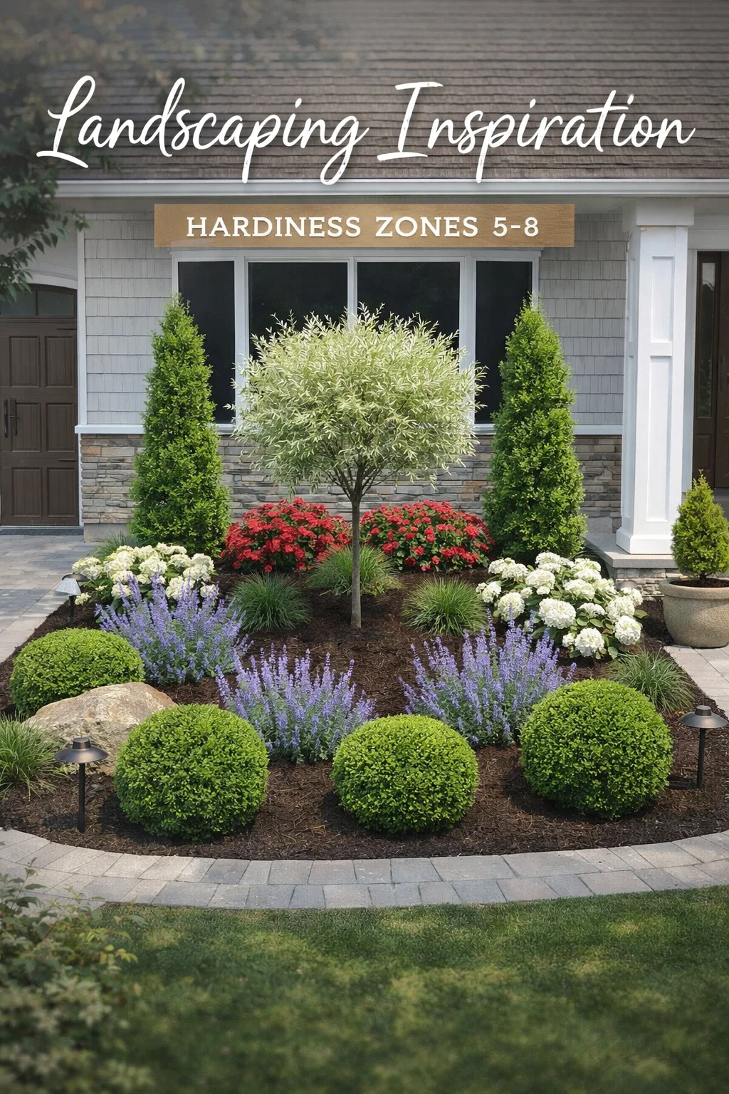 Notice how the design uses pairs of plants to create a sense of balance. The two tall, conical evergreens act as pillars, framing the central focal point. Symmetry is a classic landscaping technique that suggests order and elegance. By mirroring elements on the left and right sides of the bed, the eye is naturally drawn toward the center of the home, enhancing the overall architectural beauty of the house itself.