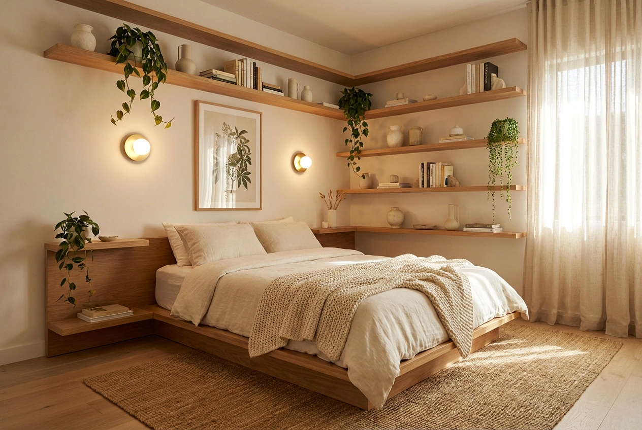 Position your low-profile bed so it relates to the shelving—perhaps framed by it or facing it. Add a simple nightstand and a comfortable chair in the nook created by the L-shape if space allows. Every piece of furniture should feel necessary and should not obstruct the clean lines of the room or the accessibility of the shelves.