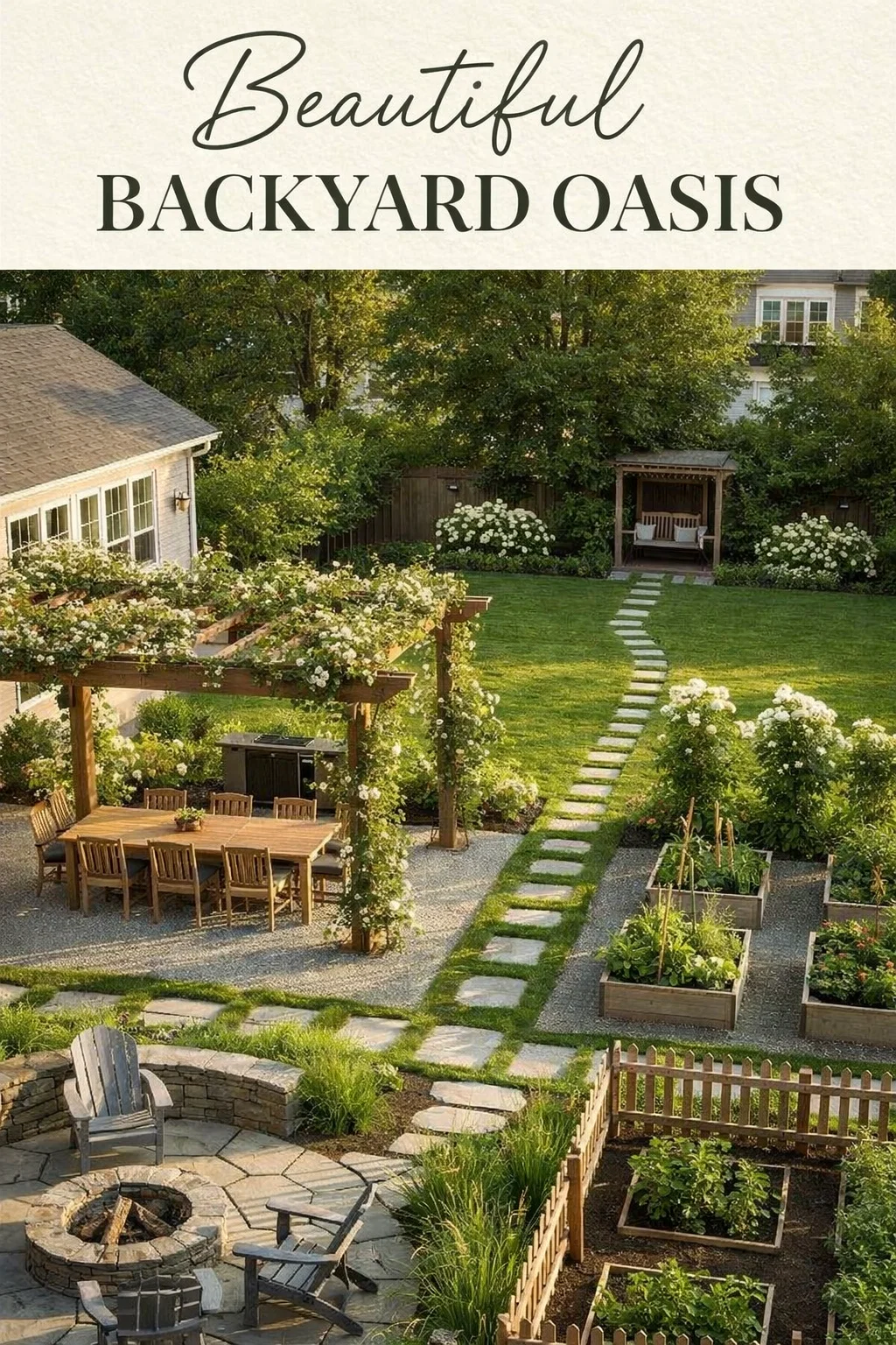 Creating a backyard that serves as a sanctuary, a kitchen, and a social hub all at once is the ultimate dream for homeowners. When we look at a well-designed outdoor space, we often see more than just grass and trees. We see a lifestyle. This particular backyard layout is a masterclass in functional aesthetics, blending the structured beauty of a formal garden with the cozy, lived-in feel of a family retreat. From the fragrant climbing roses on the pergola to the crackling warmth of a stone fire pit, every element is placed with intention to maximize both utility and beauty.