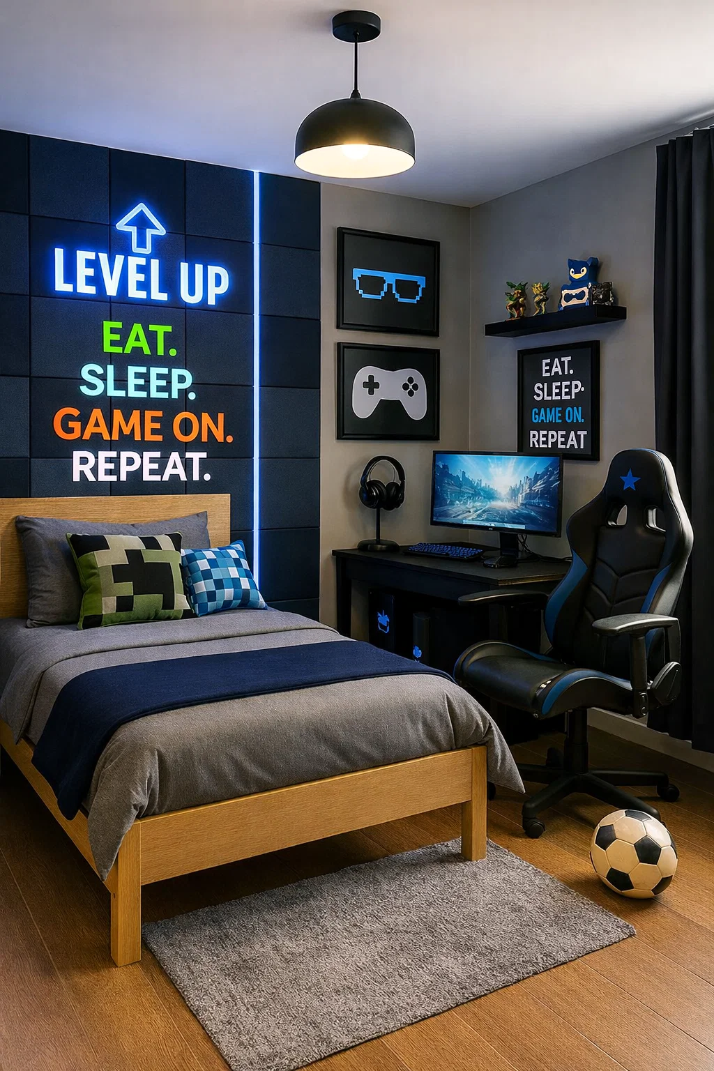 A room should tell a story about the person who lives there. In this space, the decor is a mix of pop culture references and personal interests. The framed artwork of a classic controller and pixelated glasses are nods to gaming history, while the “Eat Sleep Game Repeat” poster adds a touch of humor and personality. These elements are easy to swap out as interests change, making the room adaptable over time.