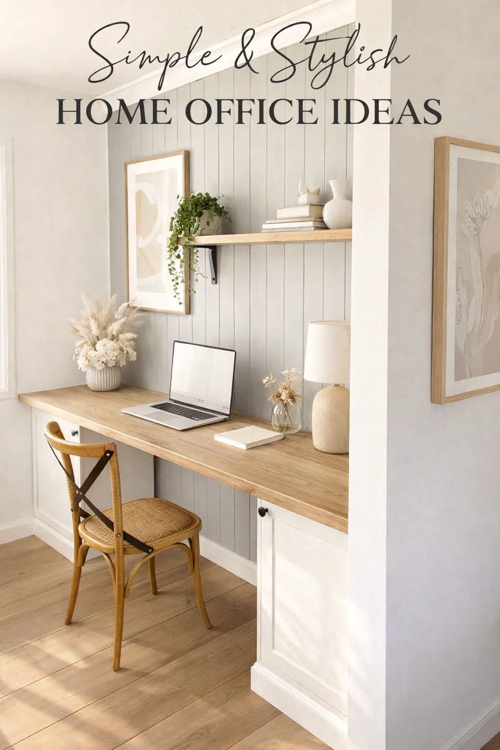 Biophilic design, which incorporates elements of nature into our indoor spaces, is a key tenet of wellness-focused interiors, and it is beautifully represented here. The trailing plant on the shelf is a perfect choice, as its cascading leaves add soft, natural shapes that contrast beautifully with the linear quality of the shiplap and shelves. The vase of dried pampas grass and cotton branches to the left of the desk adds another textural, natural element. It provides height and soft, organic forms that help to soften the entire arrangement.