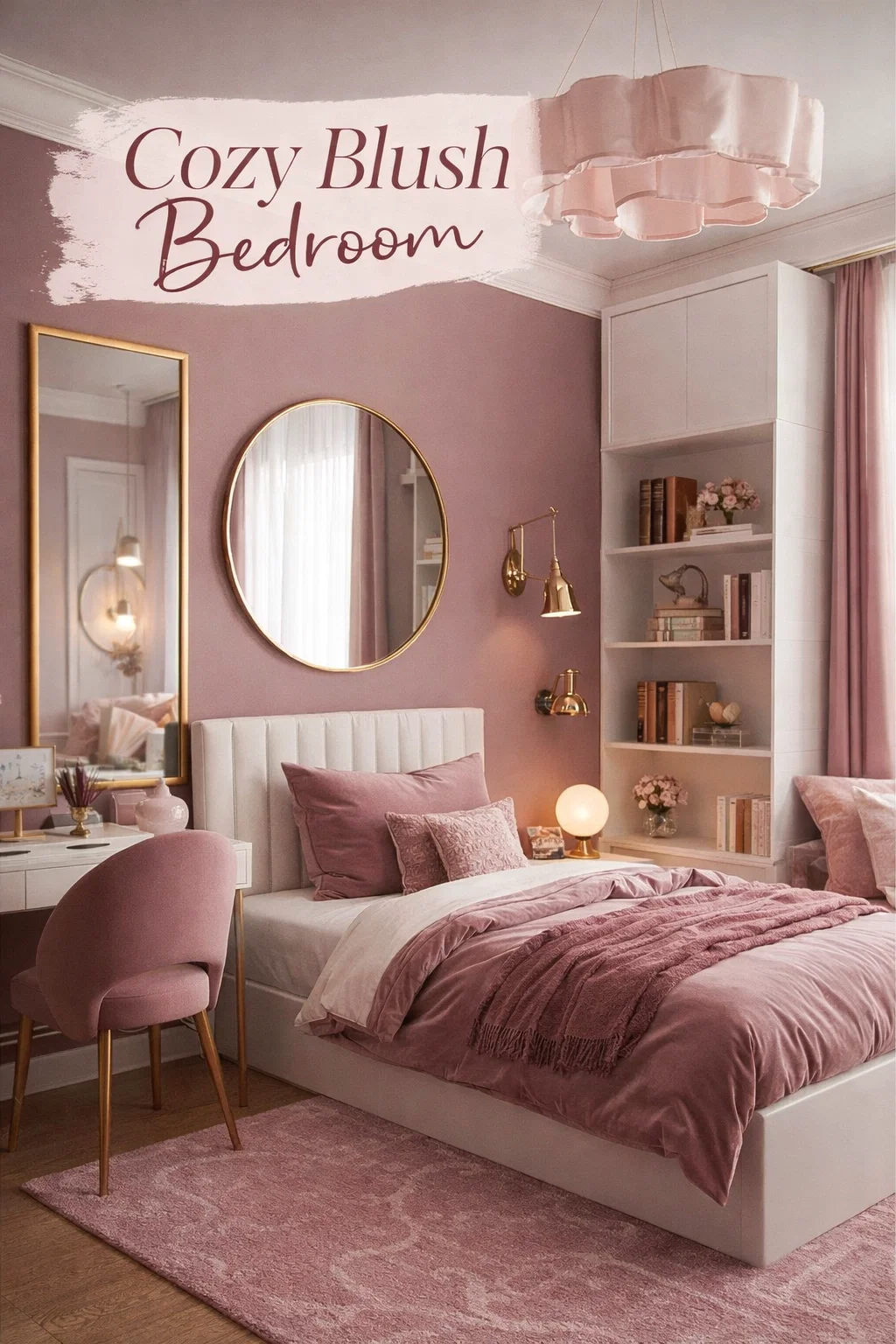 Creating a bedroom that feels both sophisticated and cozy is a delicate balancing act, but the room captured in this image provides a masterclass in how to execute it perfectly. Centered around a palette of dusty rose and muted mauve, this space demonstrates that pink isn’t just for nurseries or overly sugary designs. Instead, it can be the foundation for a mature, “grown-up” sanctuary that feels expensive and serene. By mixing textures like velvet and wood with high-shine metallic accents, this room achieves a multi-dimensional look that is as functional as it is beautiful. Whether you are looking to do a full room makeover or just want to pull a few ideas for your own space, there is a wealth of inspiration to be found in this modern aesthetic.