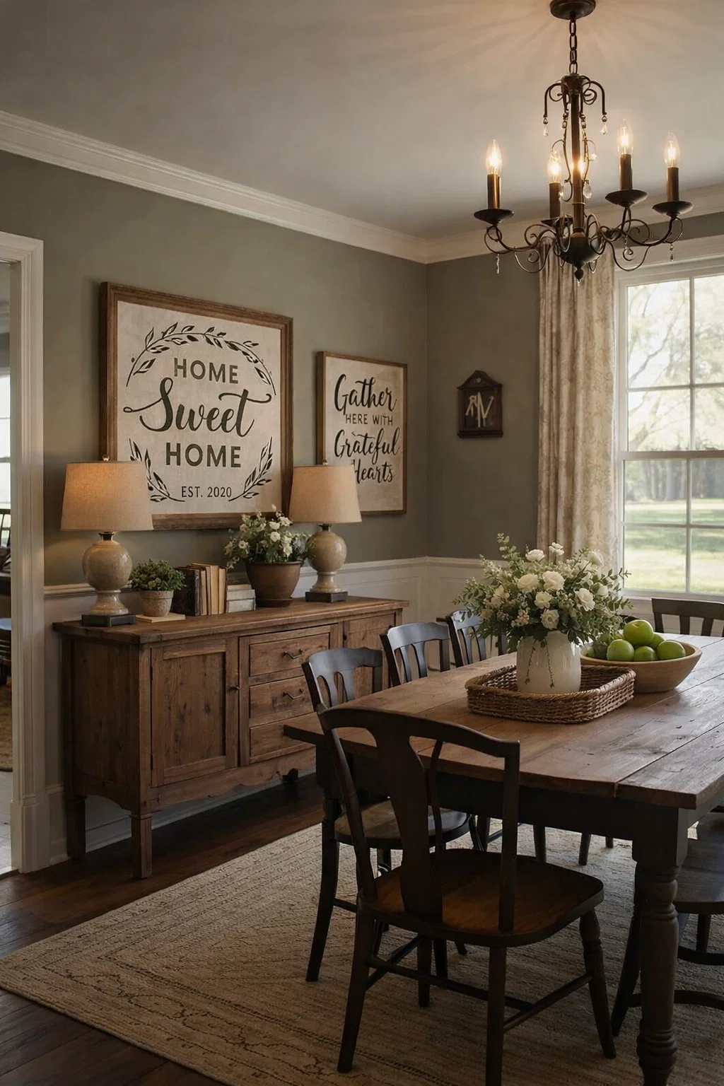 Lighting is the jewelry of a room. In this space, the chandelier is a focal point that leans into the elegant side of the farmhouse equation. A wrought iron chandelier with candle-style bulbs adds a vintage feel that complements the rustic furniture. It provides a soft, warm glow that mimics candlelight, which is far more flattering for evening dinner parties than harsh overhead lighting.