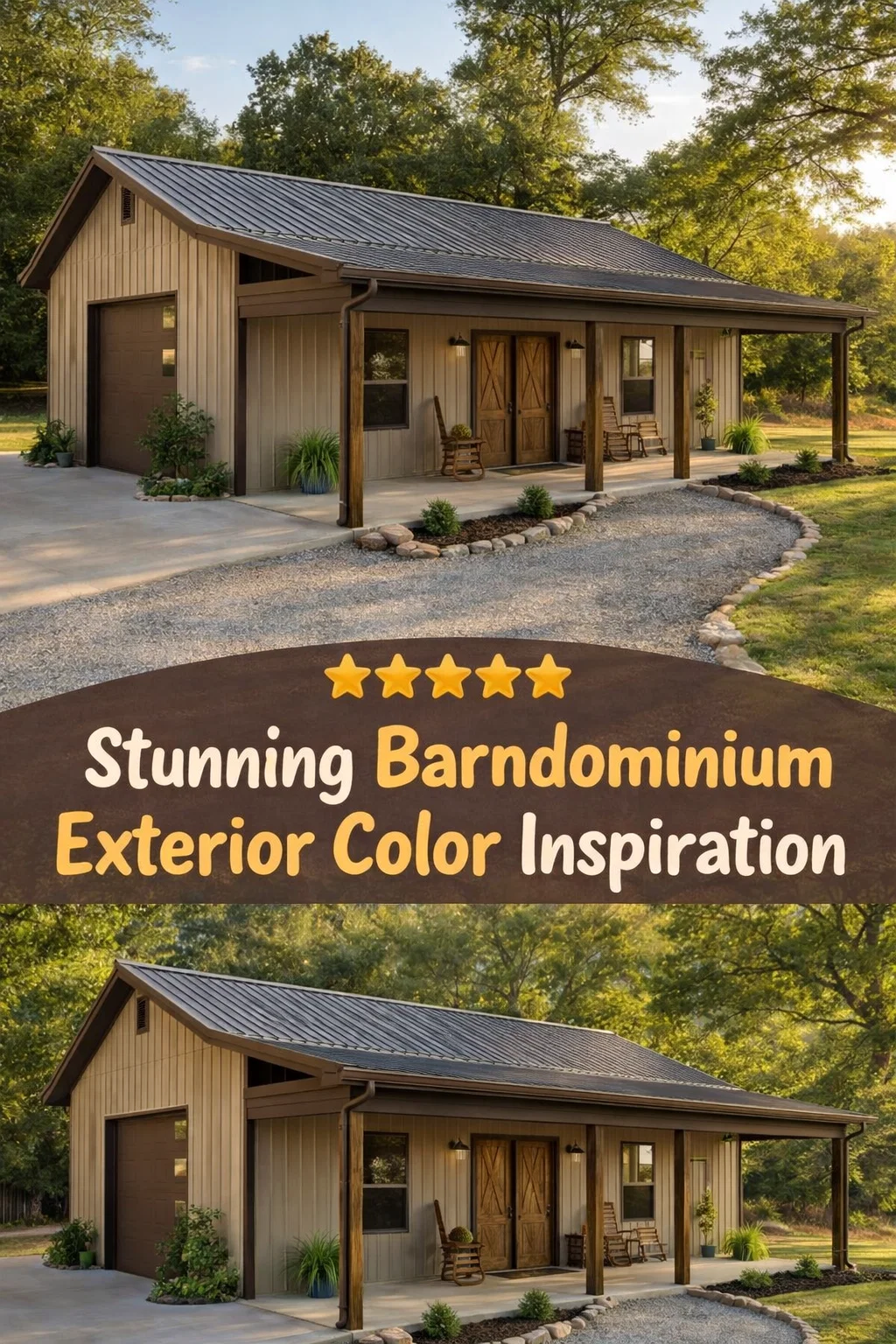 The image provided showcases a masterclass in using neutral earth tones. This specific palette is incredibly popular because it allows the large scale of a barndominium to blend harmoniously with nature rather than clashing against it. By using a warm taupe or tan for the main siding and a deep chocolate brown for the trim and roofing, the house feels grounded and established.