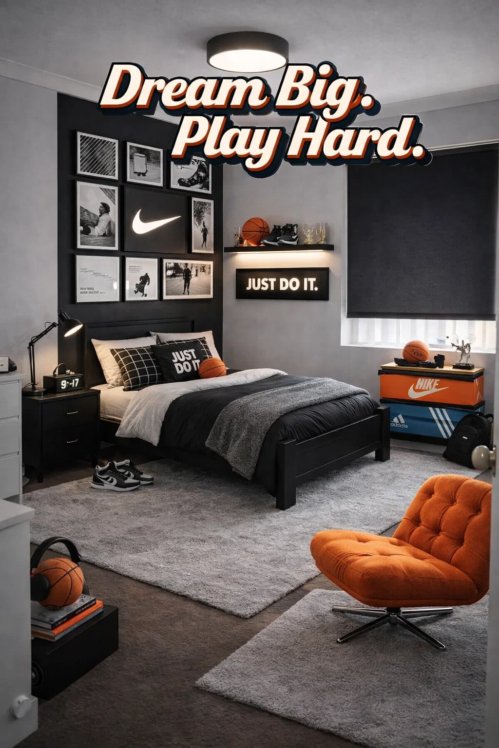 Creating a space that resonates with a teenager can be a challenge. It is the bridge between childhood and adulthood, where the room needs to serve as a bedroom, a study area, and a private sanctuary for hobbies. This stunning Nike-inspired basketball bedroom showcases how a focused theme can create a sophisticated yet high-energy environment. By combining a sleek monochromatic palette with vibrant pops of color and iconic sports branding, this design offers a blueprint for a modern teen room that feels mature, organized, and deeply personal.