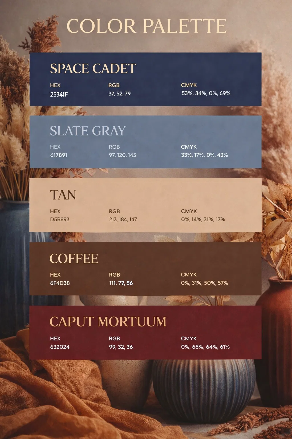 The beauty of this nature-inspired palette lies in its versatility. While it inherently leans toward a moody and sophisticated aesthetic, the proportions in which you use these colors can completely change the vibe. You might choose to let the light Tan and Slate Gray lead for a more minimalist look, or lean heavily into the Space Cadet and Caput Mortuum for a bold, dramatic statement.