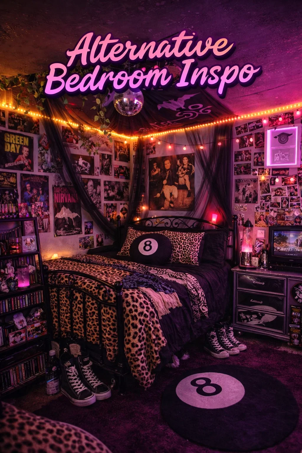 Amidst the neon lights and plastic posters, a touch of nature goes a long way. Hanging vines, whether real or faux, soften the corners of the room and bring a sense of freshness. They contrast beautifully against the pink and purple lighting, as the green leaves take on a dark, moody hue under the colored lamps. Draping these vines over the bed frame or letting them trail down from the ceiling helps to integrate the various elements of the room, acting as a natural frame for the wall decor.