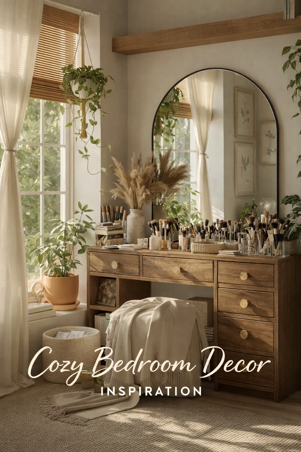 To truly elevate a brown vanity, many are turning to the boho-chic or organic modern style. This involves layering textures such as woven rugs, linen curtains, and ceramic vases. By placing a wooden desk against a backdrop of soft cream drapes, you create a high contrast environment that highlights the richness of the wood. The addition of dried pampas grass or fresh indoor plants like a Pothos or Monstera brings life to the setup, making the vanity feel like a natural extension of the outdoors.