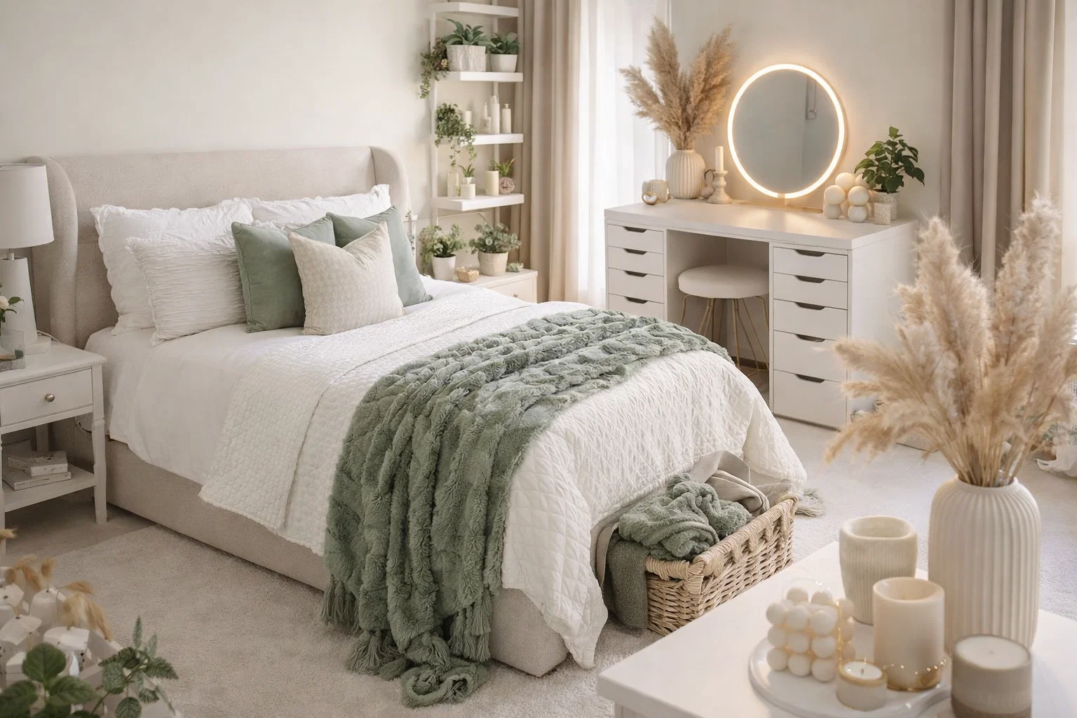 Step 4: Layer in Bedding and Soft Furnishings. Dress your bed with your sage green bedding as the base. Then, add your layered textiles: throw pillows in complementary colors and textures, and a cozy blanket draped at the foot of the bed. Hang simple curtains (even if just for decoration over blinds) to soften the windows and add height to the room.