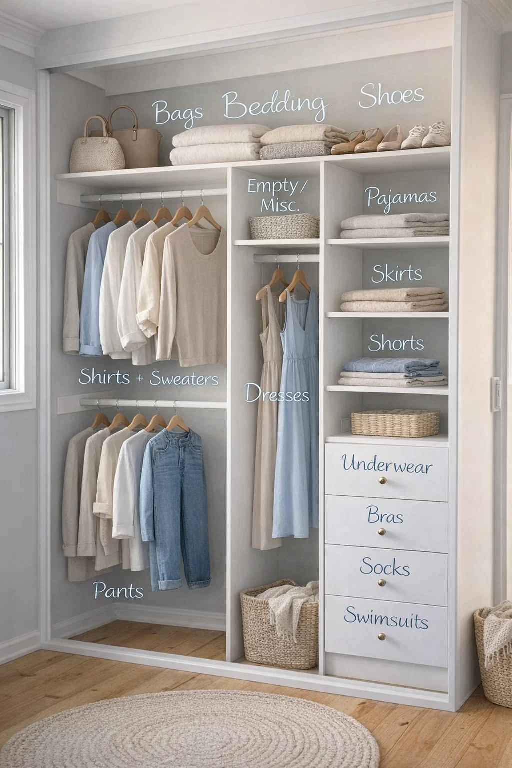 Perhaps the most functional part of this design is the integrated four-drawer chest. Having drawers inside the closet eliminates the need for a bulky dresser in the bedroom, freeing up floor space for a larger bed or a cozy reading nook. The labels in the image—Underwear, Bras, Socks, and Swimsuits—follow a logical “bottom-heavy” weight distribution. Lighter, more frequently used items like underwear stay at the top, while seasonal items like swimsuits live at the bottom.