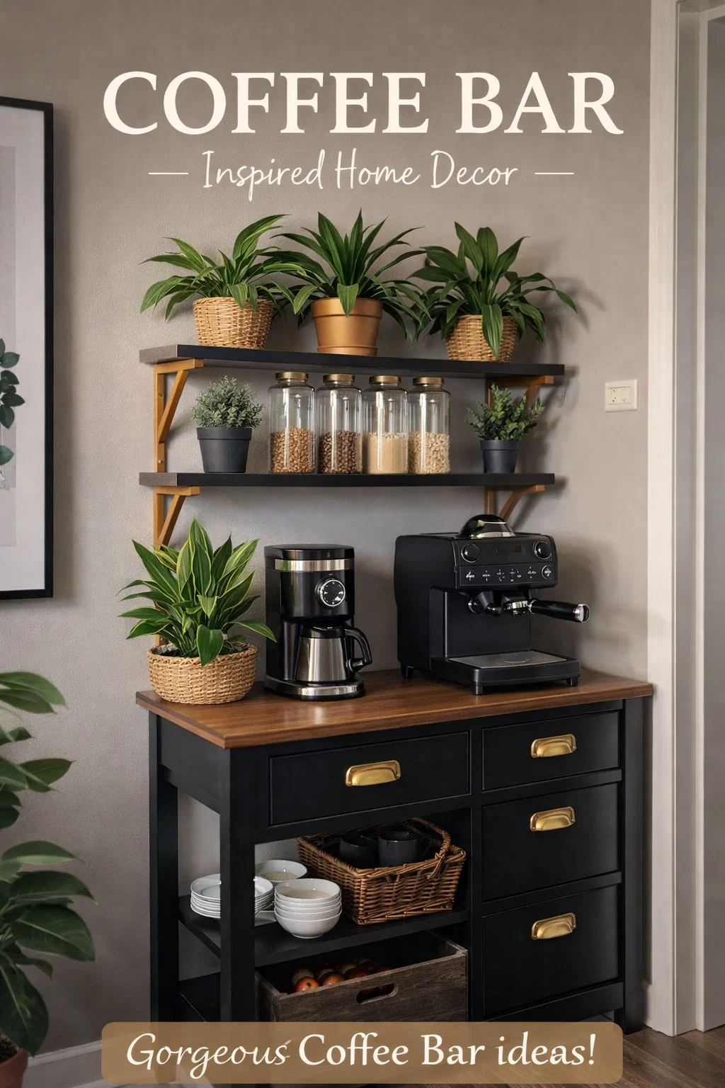 A black coffee bar is a bold choice that pays off in style and functionality. By focusing on the details like gold hardware, open shelving, and natural textures, you can create a space that feels sophisticated yet welcoming. The key is to find the right balance between the dark, modern elements and the warm, organic touches that make a house feel like a home. With a bit of planning and the right pieces, you can transform any empty wall into the ultimate caffeine sanctuary. Save these ideas and start planning your own home cafe today!