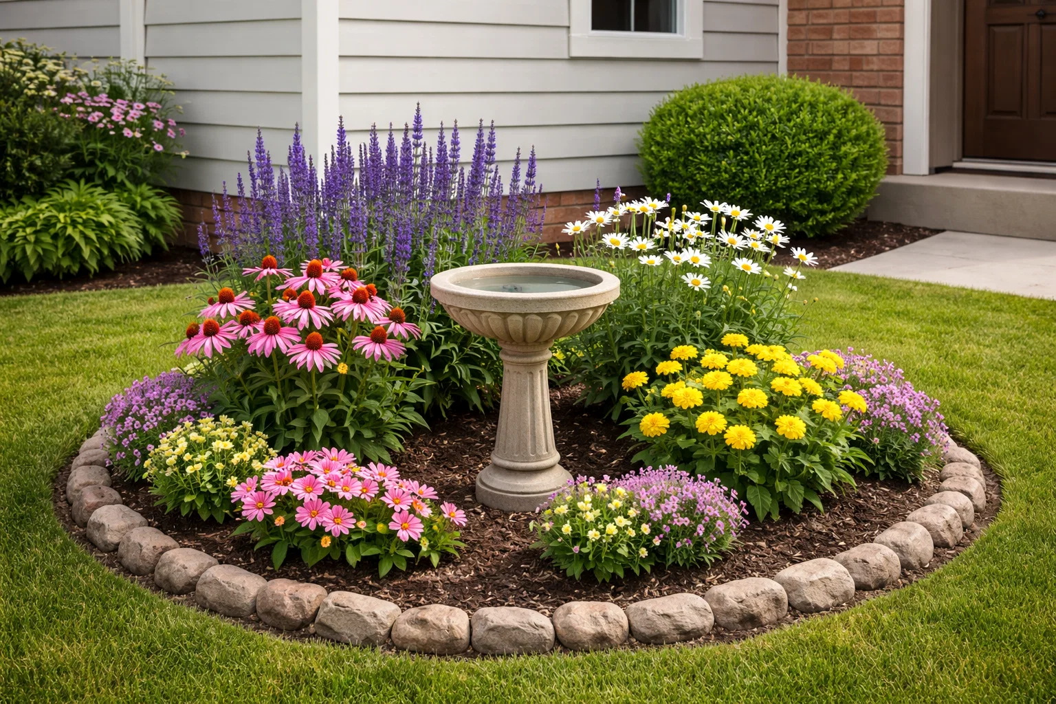Hardscape & Edging (The “Architecture”): This defines the space. Clean edges using brick, natural stone, metal landscaping strips, or even recycled materials give a polished look. A winding flagstone path through the bed can add immense charm.