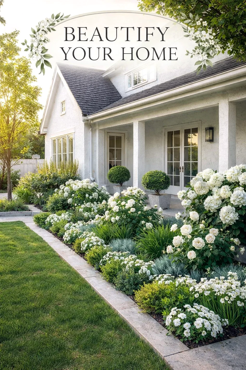 The architecture of the home in the image features white brick, a dark shingle roof, and beautiful French doors. The landscaping is designed to complement these features rather than compete with them. The tall white columns of the porch are echoed by the verticality of the plants, while the soft curves of the bushes offset the sharp angles of the gables.