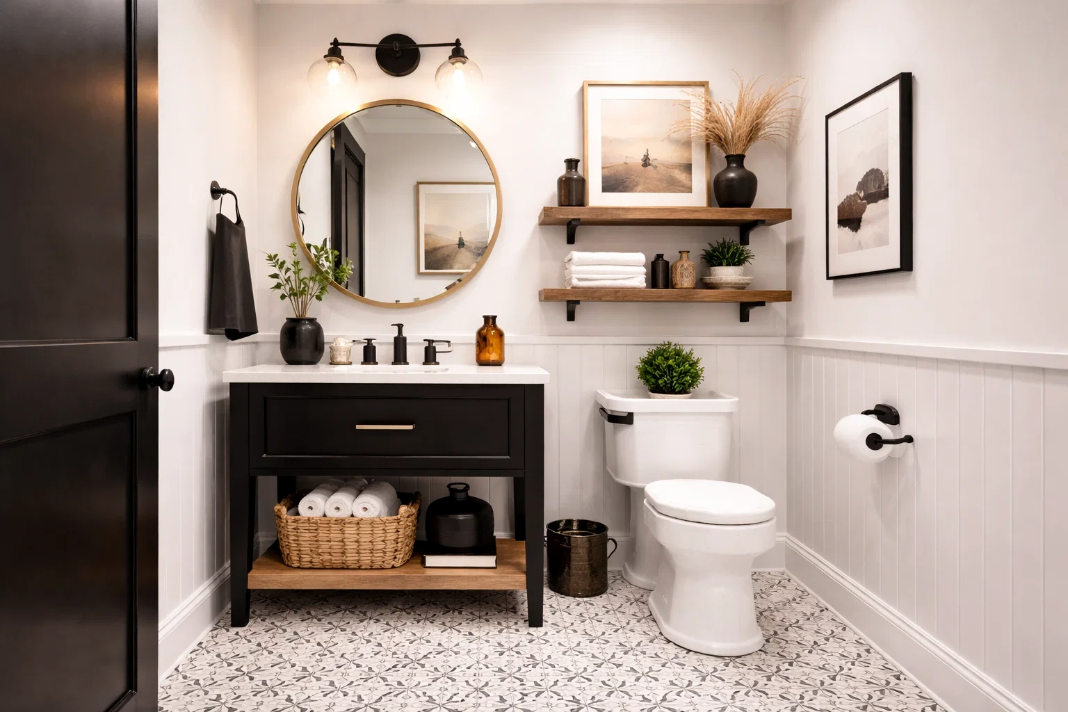 Begin by deciding your dominant color. Will it be a bright, white-dominated space with black accents, or a moody, dark sanctuary with white highlights? This decision guides all subsequent choices. Then, establish your foundational surfaces. For instance, if you own your home, select your wall and floor tiles. A safe and timeless approach is white walls (paint or tile) with a patterned black-and-white floor. If you prefer drama, consider black walls or a bold, graphic tile in the shower.