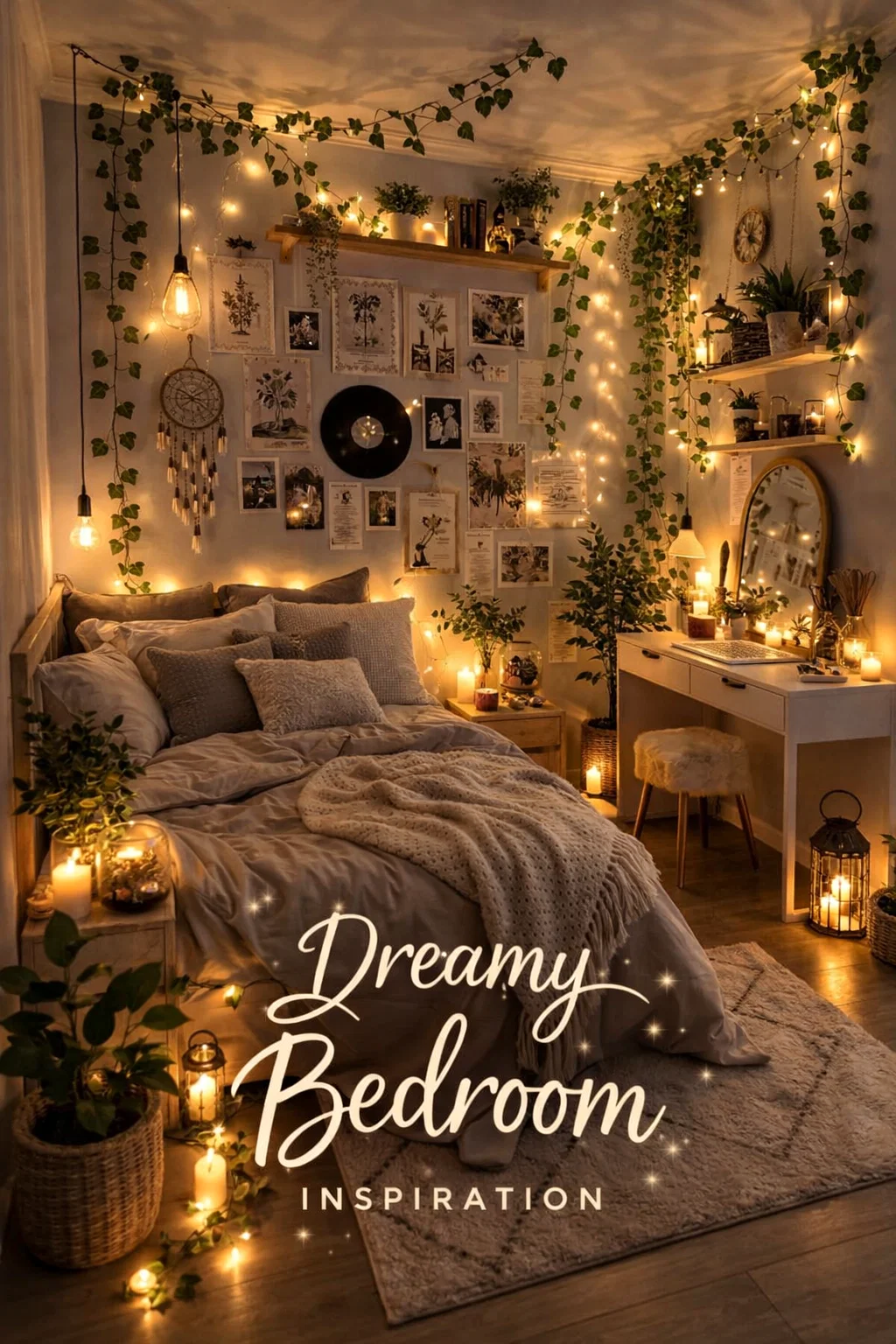 Aesthetic Cozy Bedroom Decor Ideas Fairy Lights, Vines Boho Wall Art Aesthetic