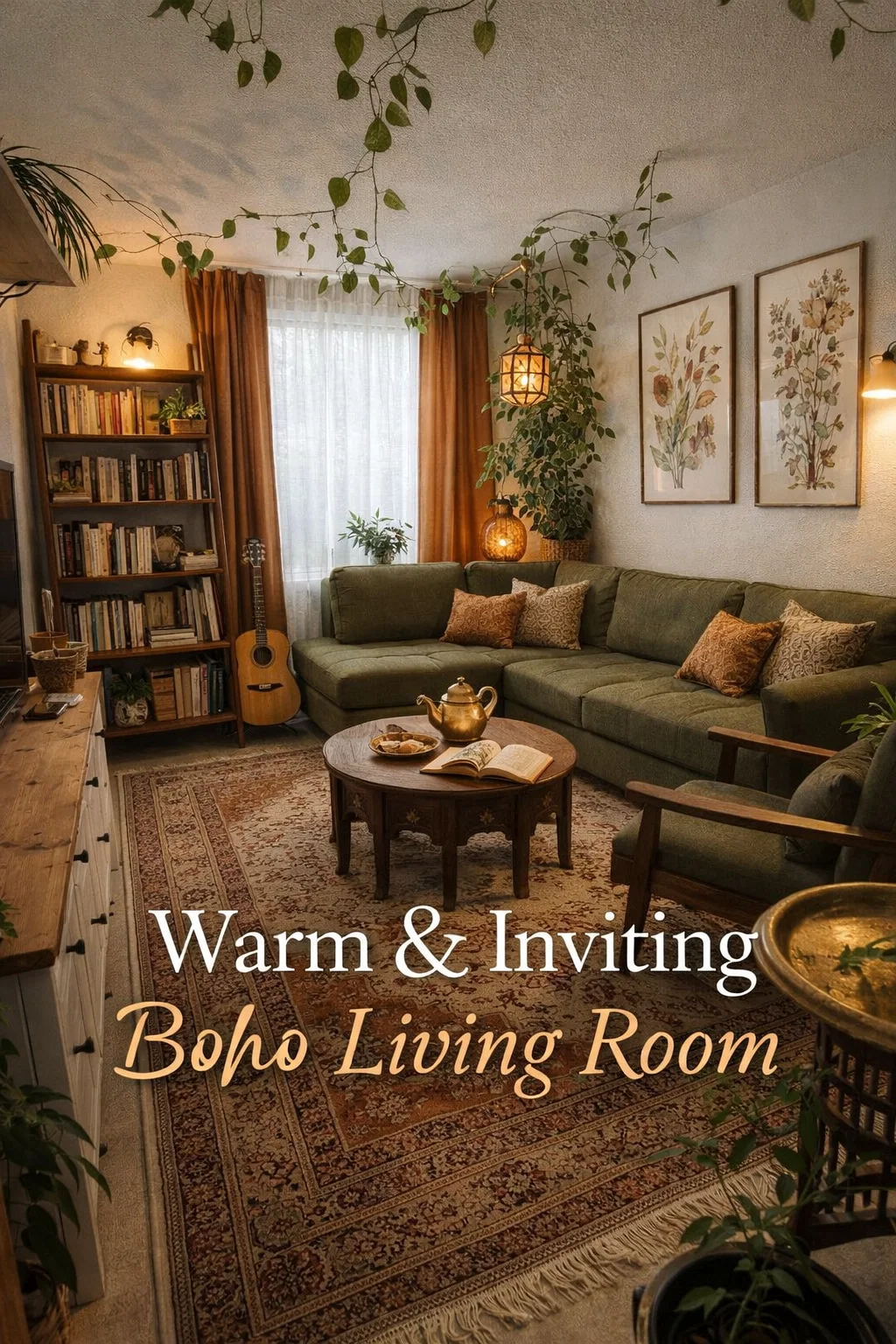 Cozy Boho Living Room Ideas Earthy Green Sofa Vintage Aesthetic Decor