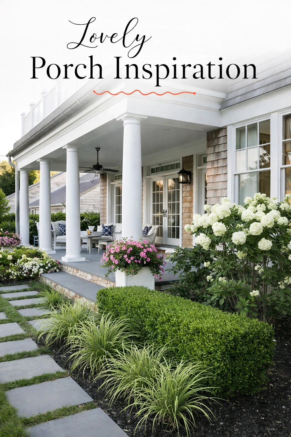 Coastal Curb Appeal Ideas Cedar Shingles, White Hydrangeas Boxwood Garden Design