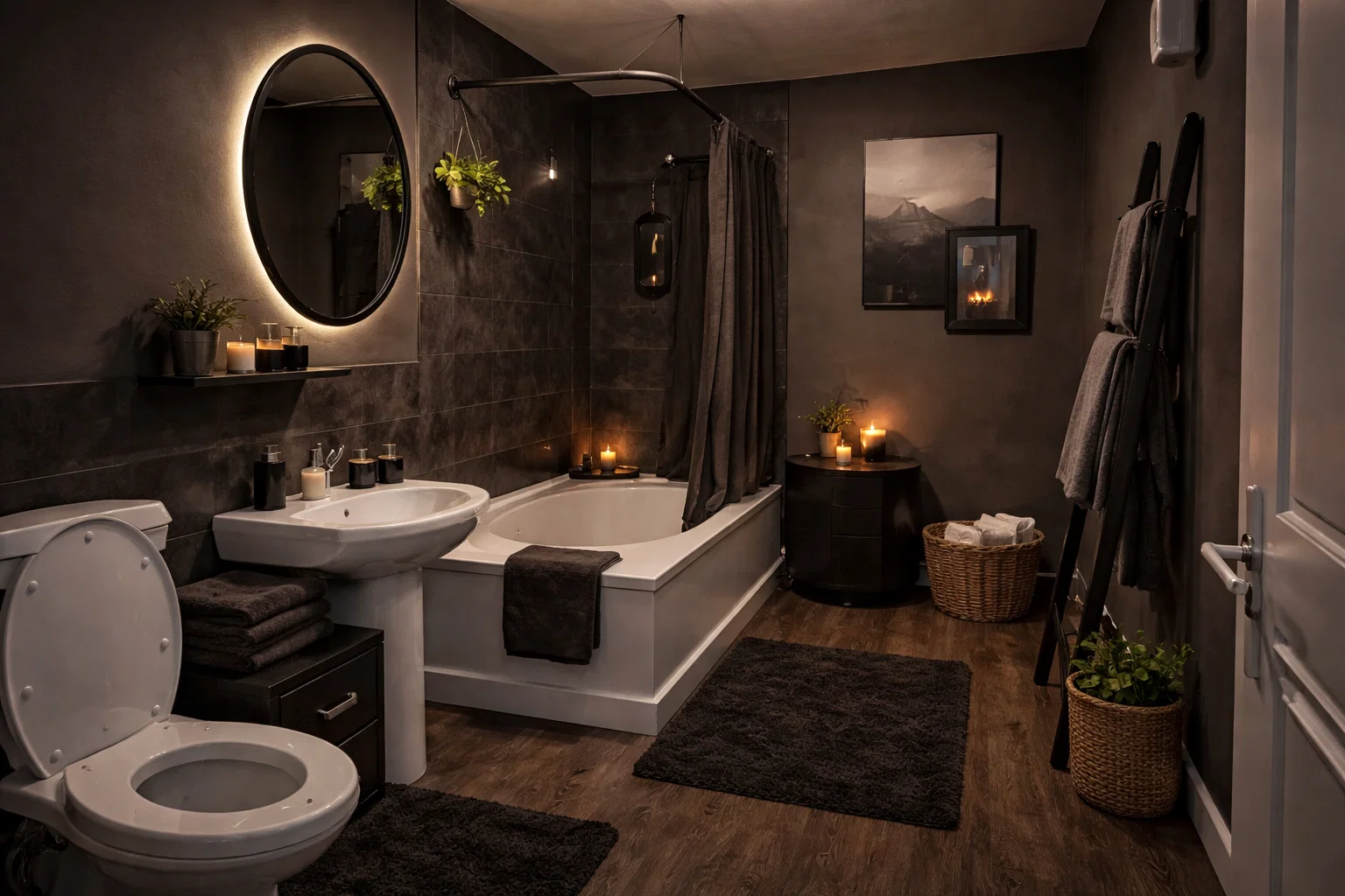 The beauty of dark bathroom decor is its adaptability. For a Modern Gothic look, pair black walls with ornate gold mirrors, crystal sconces, and velvety textures. An Industrial Dark bathroom might feature charcoal concrete-look tiles, exposed pipework in black, and utilitarian lighting. A Cozy Organic style could use deep green walls with abundant wood, stone vessel sinks, and woven baskets.