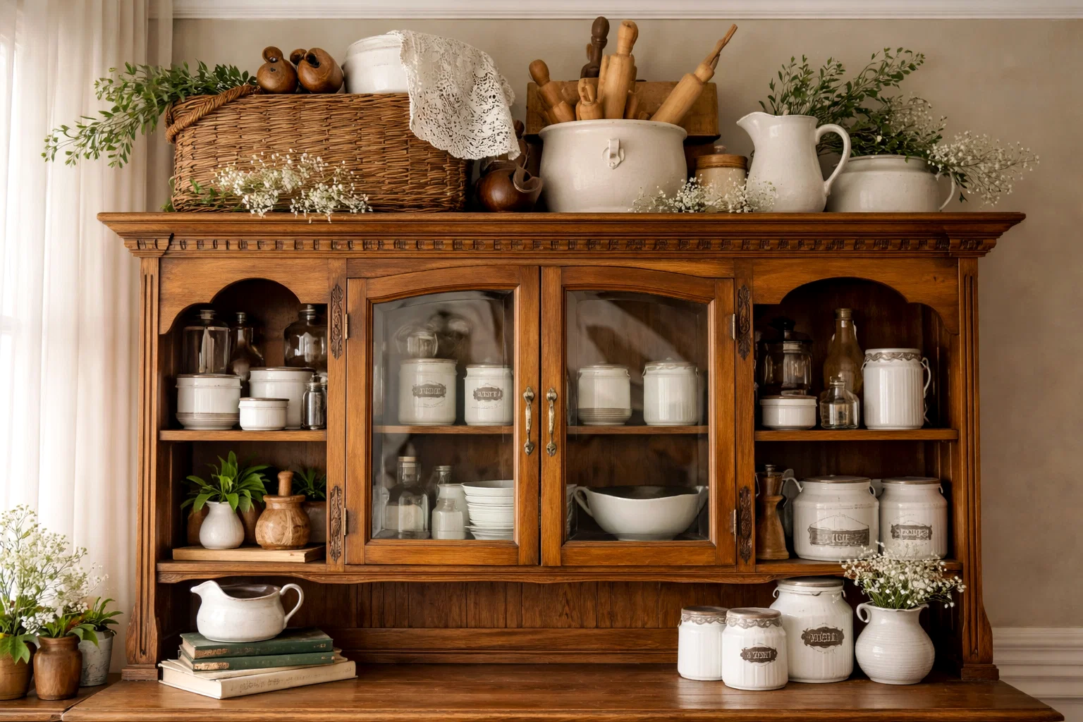 The best hutch styling adapts to your specific piece and budget. For a modern farmhouse look, use open shelving with white dishes, woven baskets, ironstone pitchers, and wooden cutting boards. A minimalist modern style calls for clean lines: a limited palette, a single sculptural vase, and plenty of negative space.