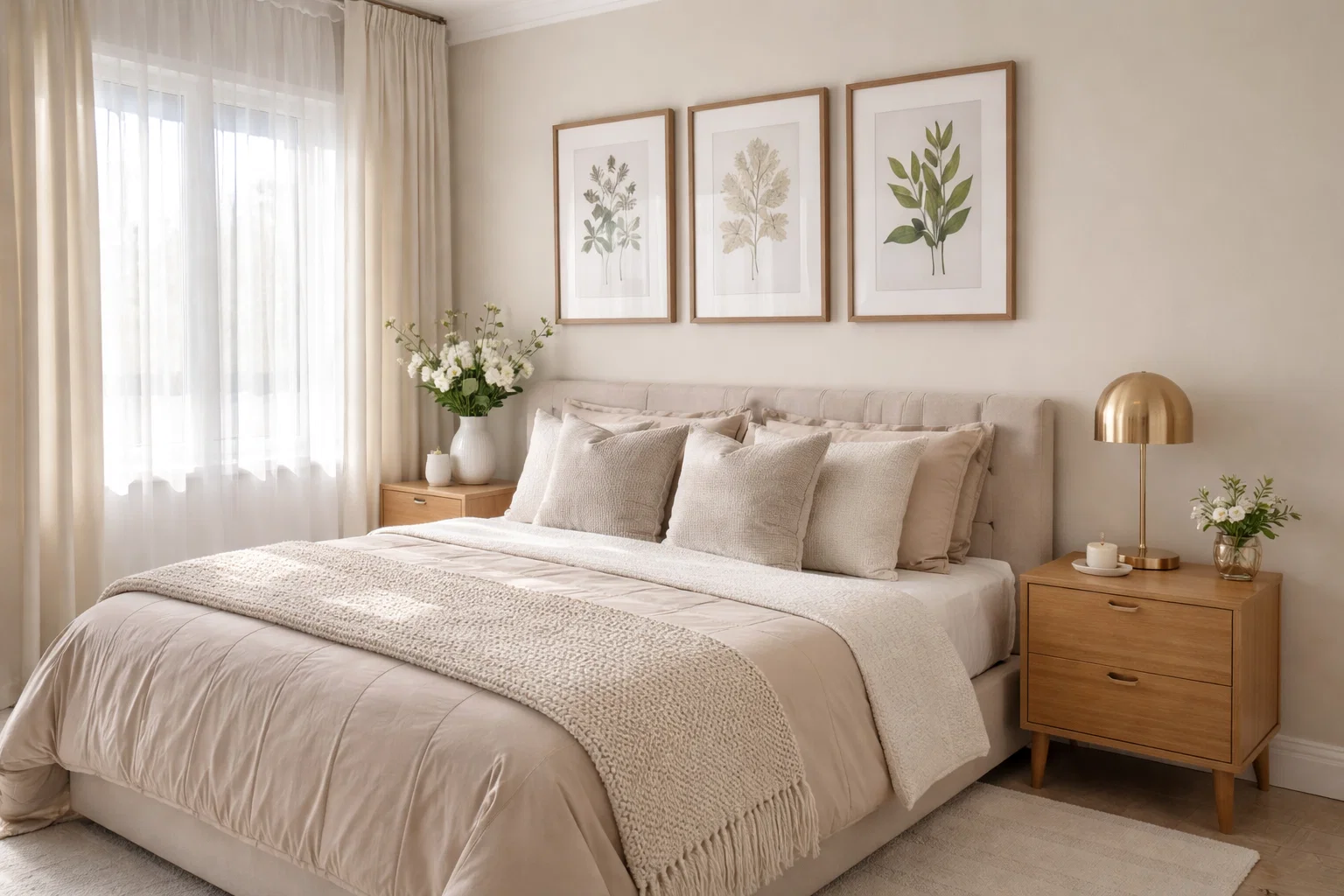 - Personalized Art & Decor: Choose a few meaningful pieces rather than many small ones. One large piece of art above the bed or a curated gallery wall can set the tone. Add life with a low-maintenance houseplant or a simple vase with fresh or dried stems. A small stack of beautiful books or a unique trinket dish adds personality without clutter.