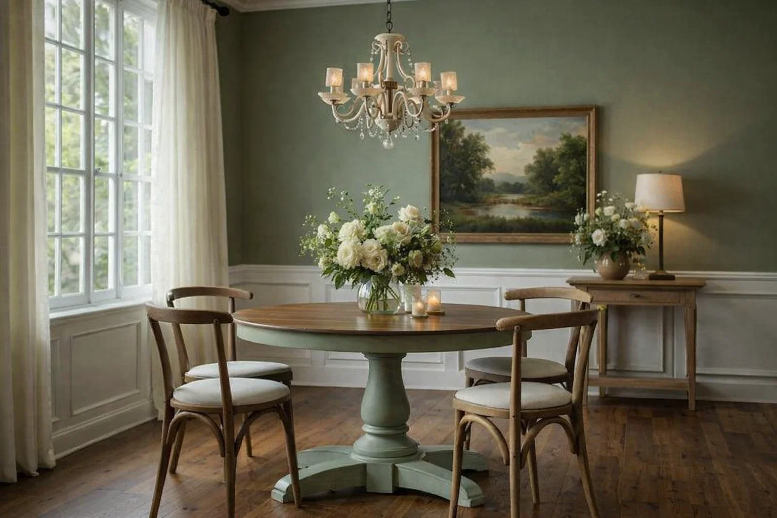 Start with textiles and accessories. Introduce a set of green dining chairs or chair cushions. Layer a green-hued rug under your table. Dress your table with a green runner, placemats, and napkins. Then, add art with green landscapes or abstract forms, and finish with plenty of green plants in varied sizes and textures. These elements will inject the color without a single brushstroke.