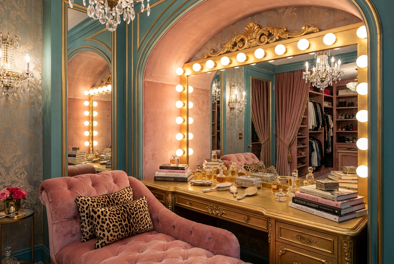 - Theatrical Lighting: Harsh overhead lights are forbidden! Opt for ambient, flattering illumination. Crystal table lamps, vintage-inspired Hollywood bulb mirrors, or a small, elegant chandelier provide the perfect glow for applying makeup and set a luxurious mood.
