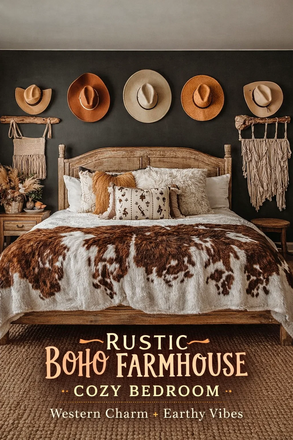 Traditional framed art is wonderful, but the western boho movement has introduced a much more functional and stylish way to decorate your walls: the hat gallery. Hanging your collection of felt and straw cowboy hats directly above the headboard serves two purposes. It keeps your accessories organized and shape-protected, and it creates a stunning 3D art installation. By varying the colors of the hats from sandy beige to burnt orange and chocolate brown, you create a rhythmic flow across the wall that draws the eye upward and makes the ceiling feel higher.
